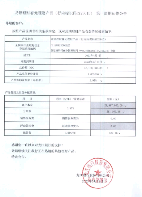 龙银理财睿元理财产品(行内标识码RY23015)第一周期运作公告