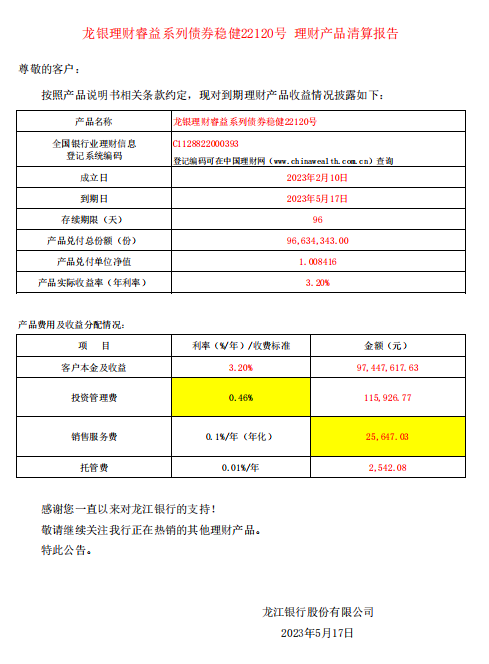 龙银理财睿益系列债券稳健22120号 理财产品清算报告
