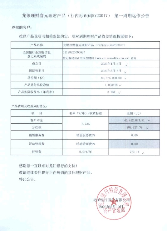 龙银理财睿元理财产品(行内标识码RY23017)第一周期运作公告