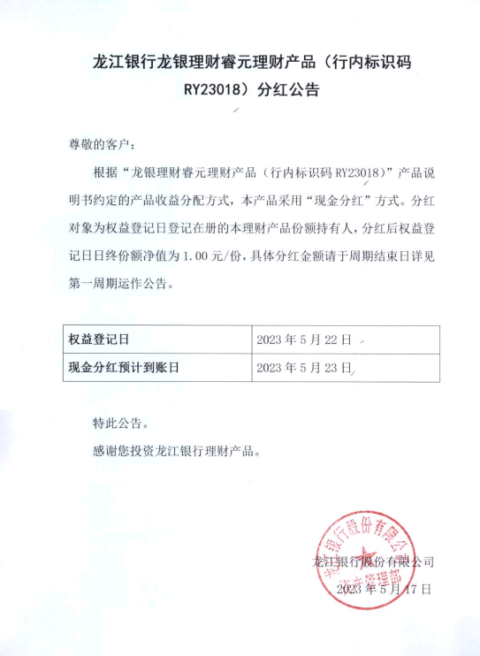 龙江银行龙银理财睿元理财产品(行内标识码RY23018)分红公告
