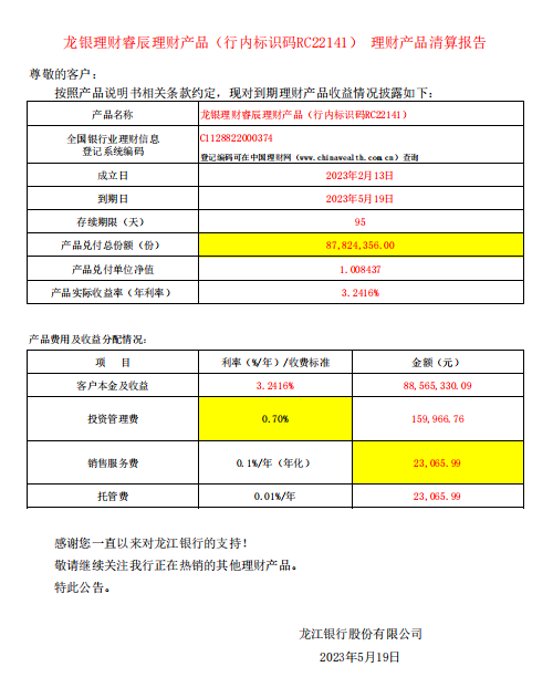 龙银理财睿辰理财产品(行内标识码RC22141)理财产品清算报告