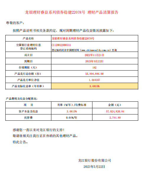 龙银理财睿益系列债券稳健22078号 理财产品清算报告