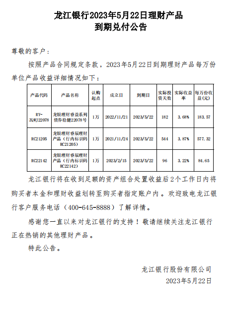 龙江银行2023年5月22日理财产品到期兑付公告