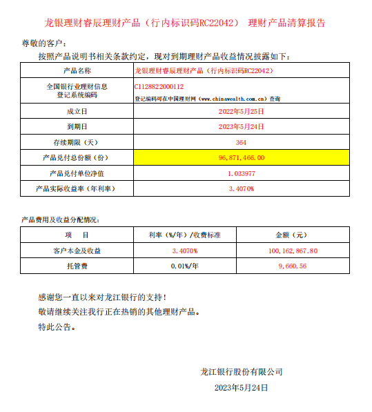 龙银理财睿辰理财产品(行内标识码RC22042)理财产品清算报告