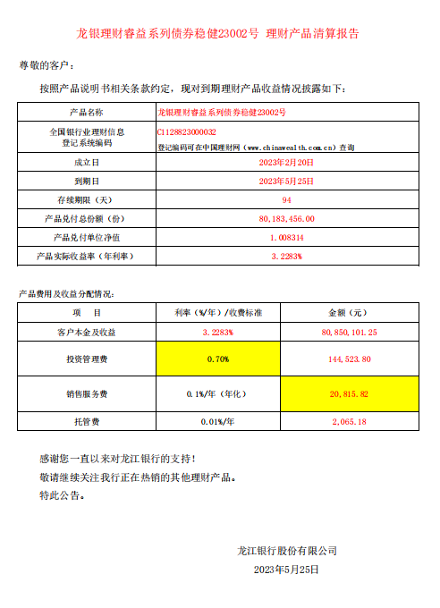 龙银理财睿益系列债券稳健23002号 理财产品清算报告