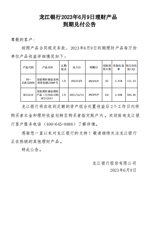 龙江银行2023年6月9日理财产品到期兑付公告