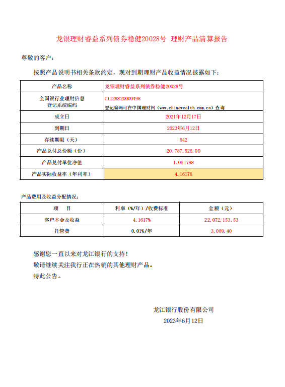 龙银理财睿益系列债券稳健20028号理财产品清算报告