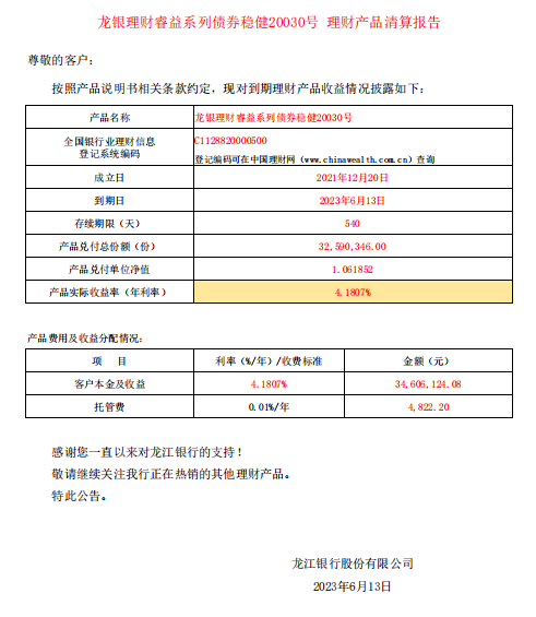 龙银理财睿益系列债券稳健20030号理财产品清算报告