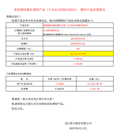 龙银理财睿辰理财产品RC22052号理财产品清算报告