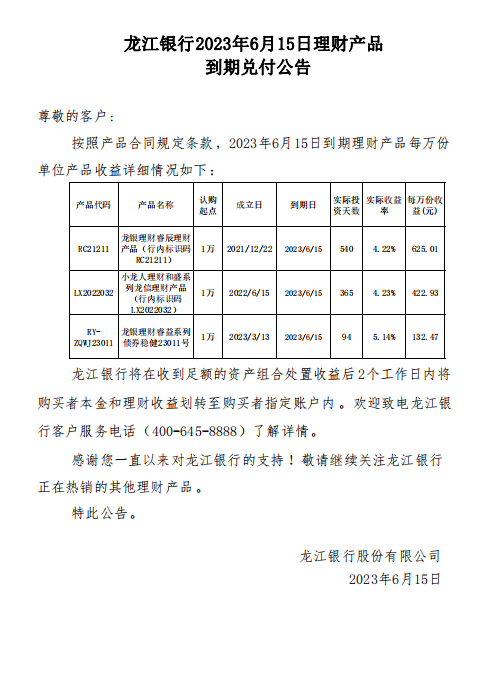 龙江银行2023年6月15日理财产品到期兑付公告