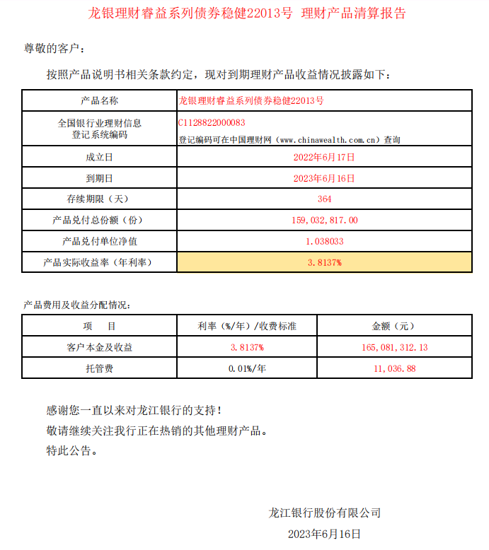 龙银理财睿益系列债券稳健22013号理财产品清算报告