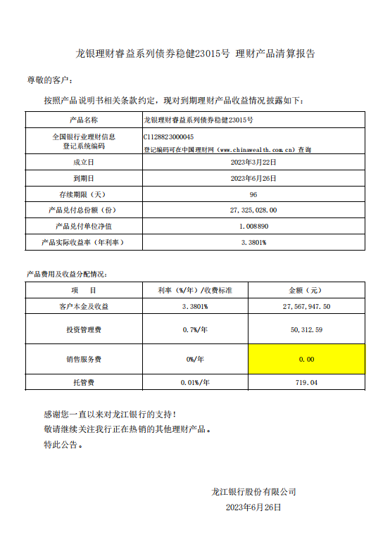 龙银理财睿益系列债券稳健23015号理财产品清算报告