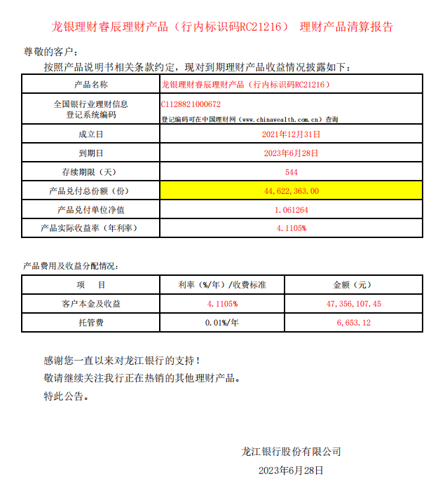20230628龙银理财睿辰理财产品RC21216号理财产品清算报告