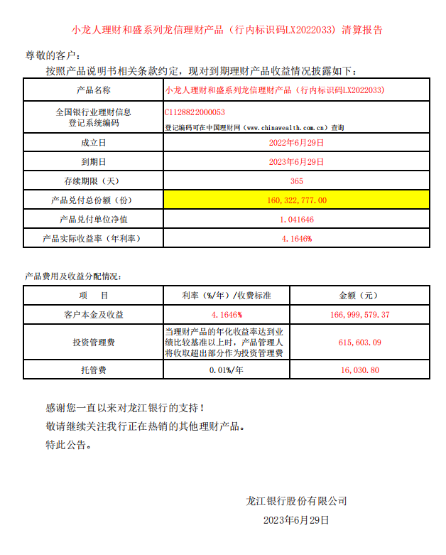 20230629小龙人理财和盛系列龙信理财产品LX2022033清算报告