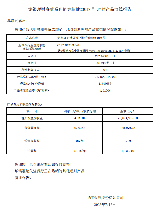 龙银理财睿益系列债券稳健23019号理财产品清算报告