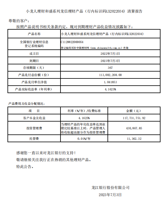小龙人理财和盛系列龙信理财产品LX2022034清算报告