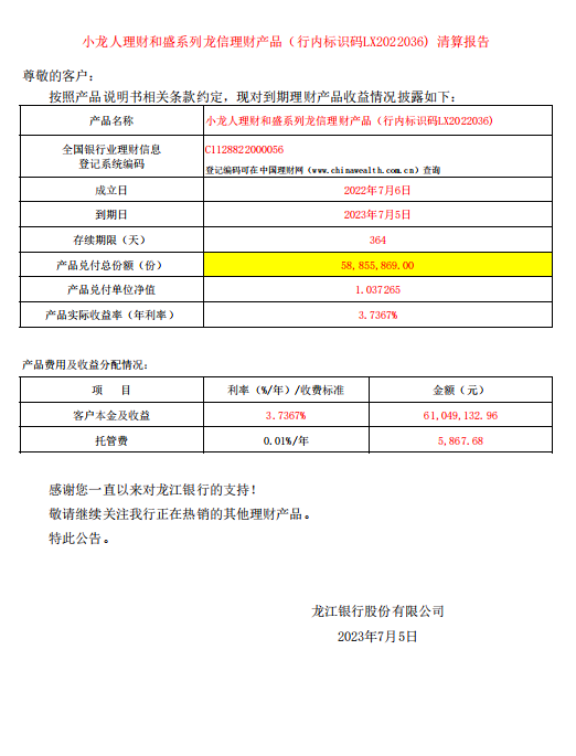 小龙人理财和盛系列龙信理财产品LX2022036清算报告