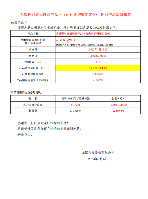 20230706龙银理财睿辰理财产品RC21219号理财产品清算报告