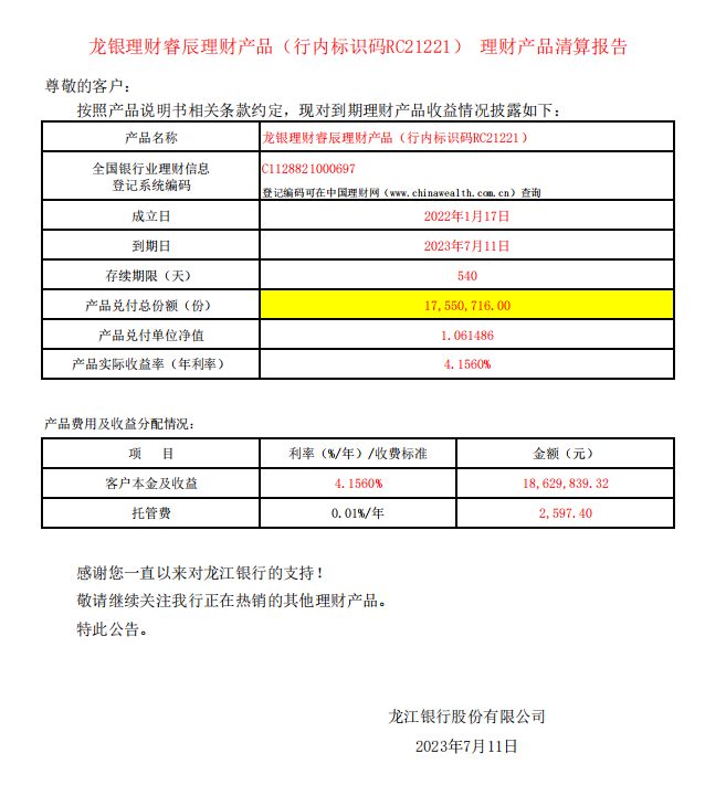 龙银理财睿辰理财产品RC21221号理财产品清算报告