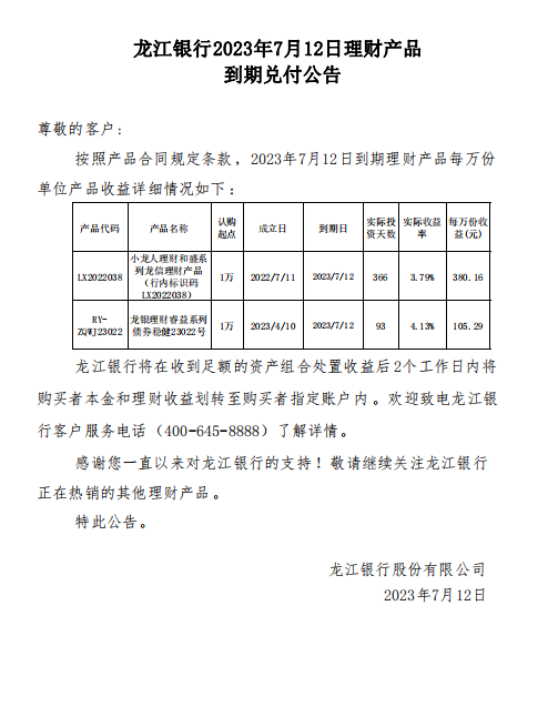 龙江银行2023年7月12日理财产品到期兑付公告