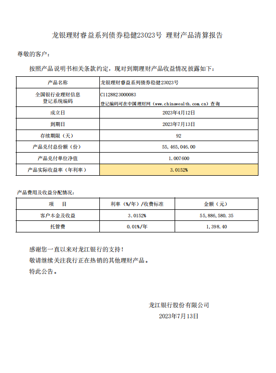 龙银理财睿益系列债券稳健23023号理财产品清算报告