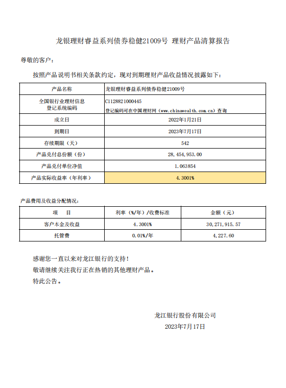 龙银理财睿益系列债券稳健21009号理财产品清算报告