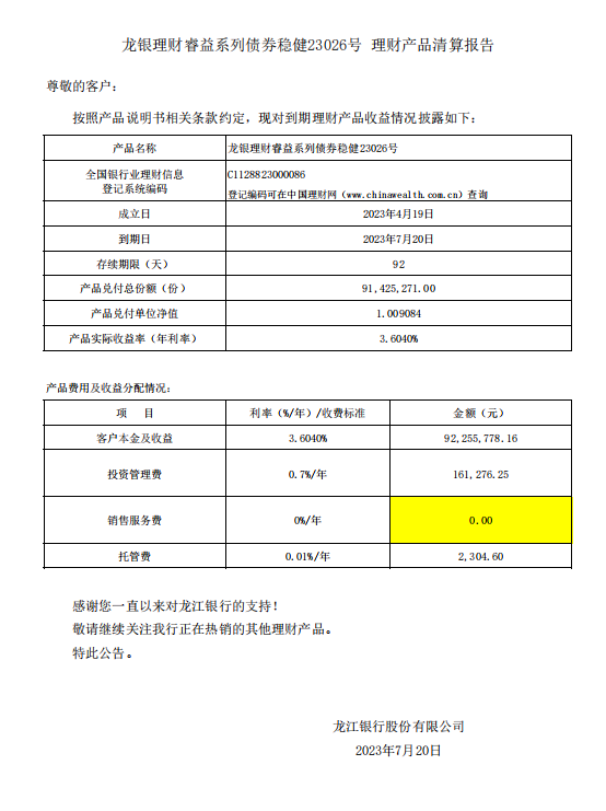 龙银理财睿益系列债券稳健23026号理财产品清算报告