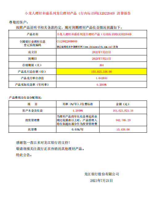 小龙人理财和盛系列龙信理财产品LX2022040清算报告