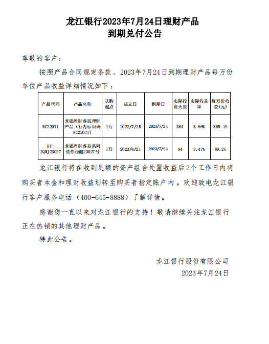 龙江银行2023年7月24日理财产品到期兑付公告