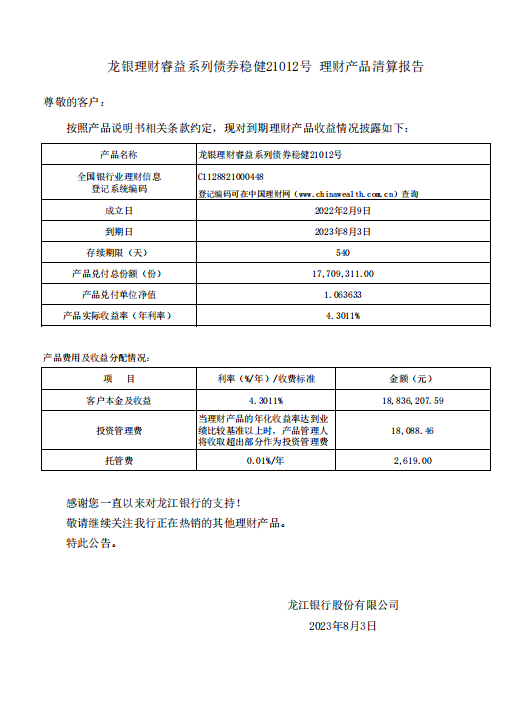 20230803龙银理财睿益系列债券稳健21012号理财产品清算报告