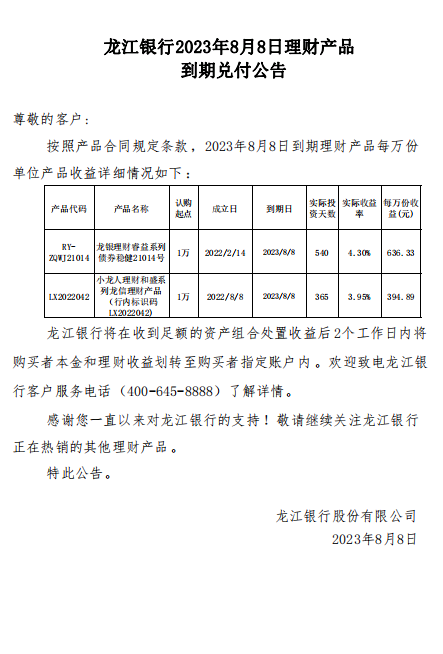 龙江银行2023年8月8日理财产品到期兑付公告