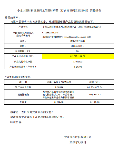 小龙人理财和盛系列龙信理财产品LX2022043清算报告