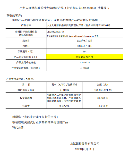 小龙人理财和盛系列龙信理财产品LX2022044清算报告