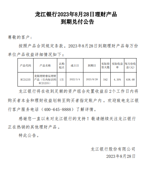 龙江银行2023年8月28日理财产品到期兑付公告