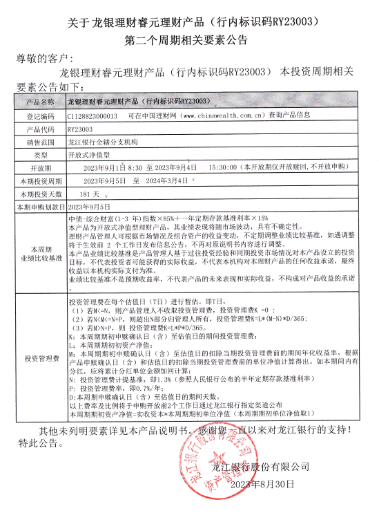 关于龙银理财睿元理财产品(行内标识码RY23003)第二个周期相关要素公告