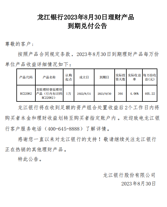 龙江银行2023年8月30日理财产品到期兑付公告