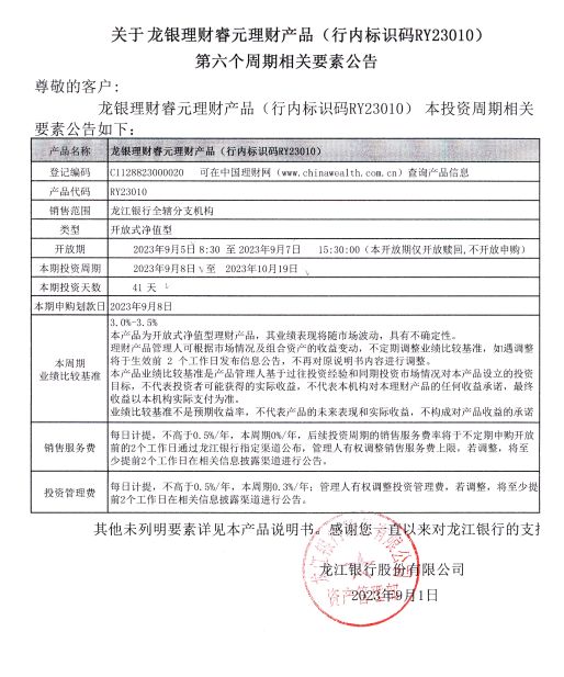 龙银理财睿元理财产品(行内标识码RY23010)第六个周期相关要素公告