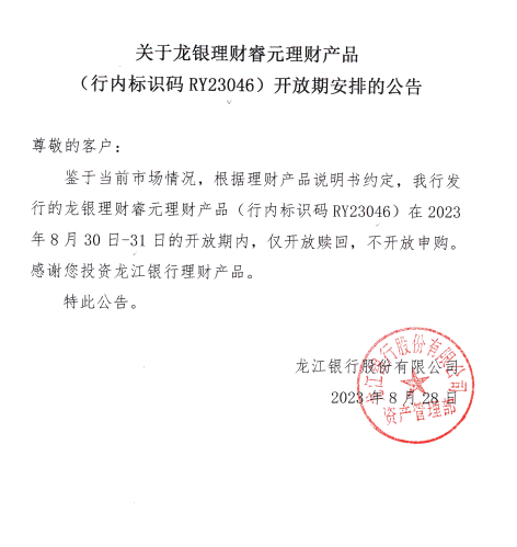 龙银理财睿元理财产品(行内标识码RY23046)开放期安排的公告
