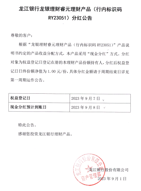 龙银理财睿元理财产品(行内标识码RY23051)分红公告