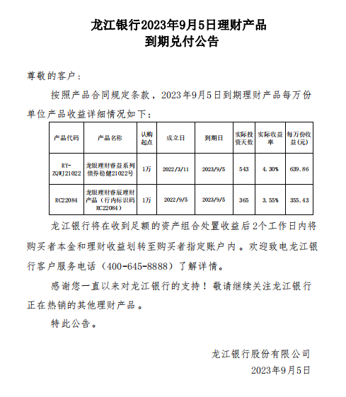 龙江银行2023年9月5日理财产品到期兑付公告