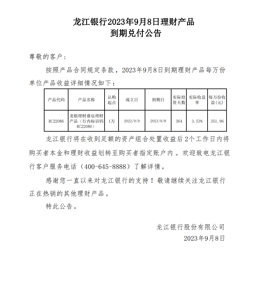 龙江银行2023年9月8日理财产品到期兑付公告