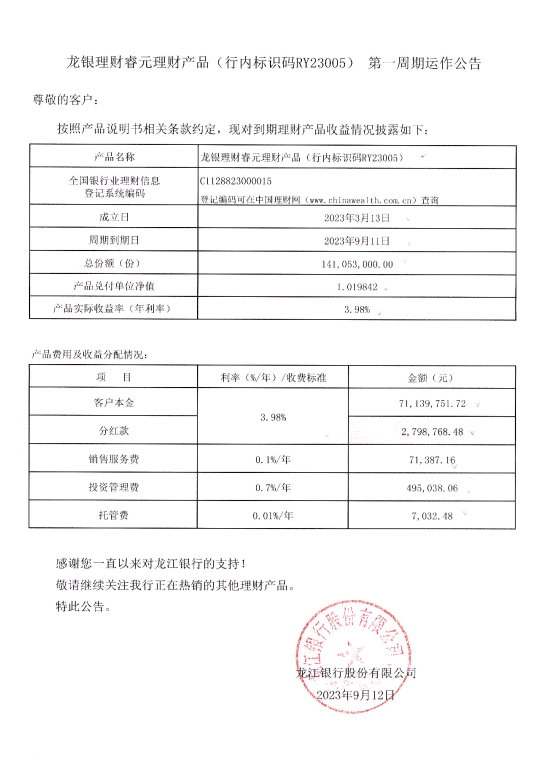 龙银理财睿元理财产品(行内标识码RY23005)第一周期运作公告