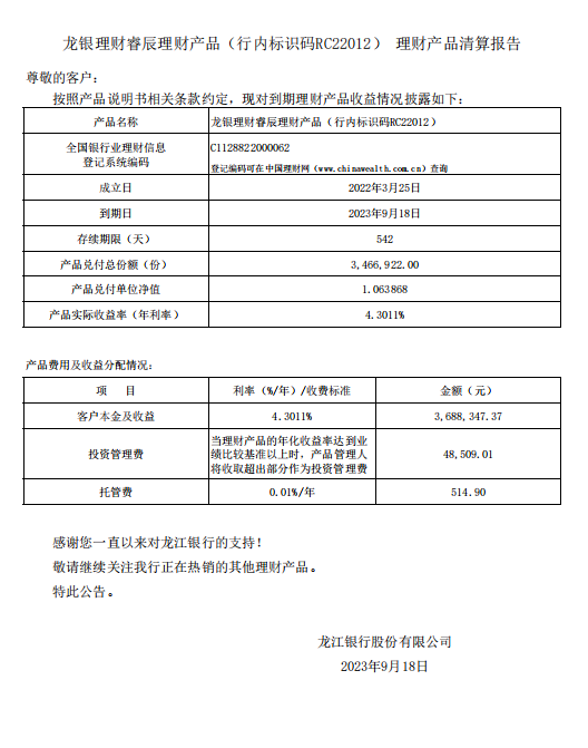 龙银理财睿辰理财产品RC22012号理财产品清算报告