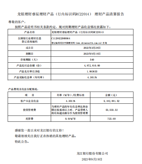 龙银理财睿辰理财产品RC22014号理财产品清算报告