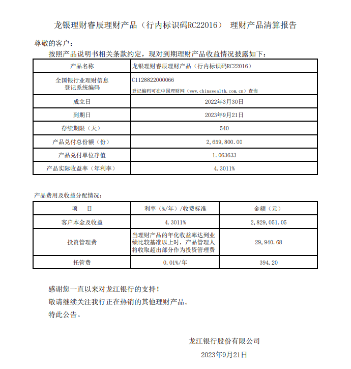 龙银理财睿辰理财产品RC22016号理财产品清算报告