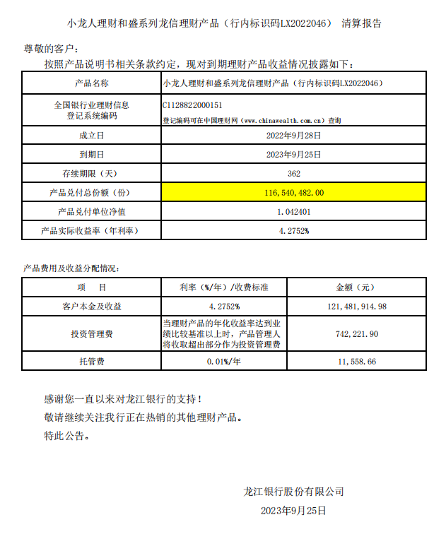 小龙人理财和盛系列龙信理财产品LX2022046清算报告
