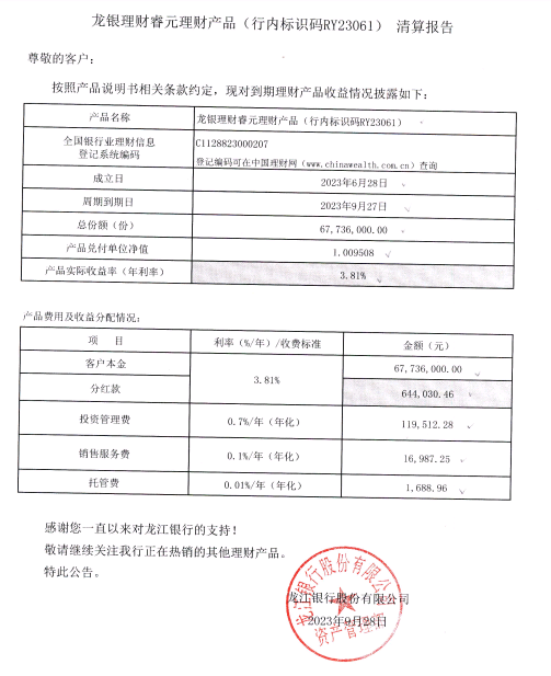龙银理财睿元理财产品(行内标识码RY23061)清算报告