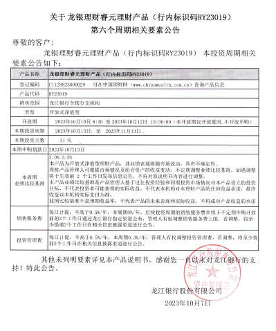龙银理财睿元理财产品(行内标识码RY23019)第六个周期相关要素公告
