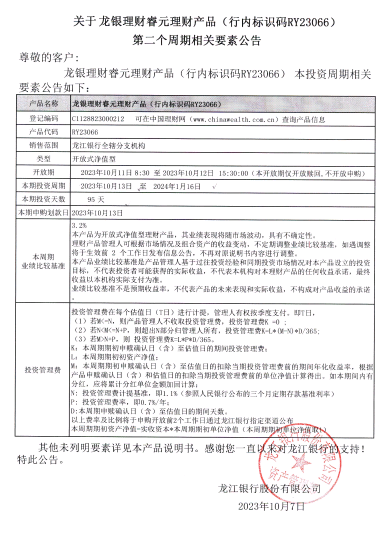 龙银理财睿元理财产品(行内标识码RY23066)第二个周期相关要素公告