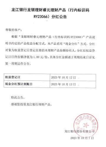 龙银理财睿元理财产品(行内标识码RY23066)分红公告